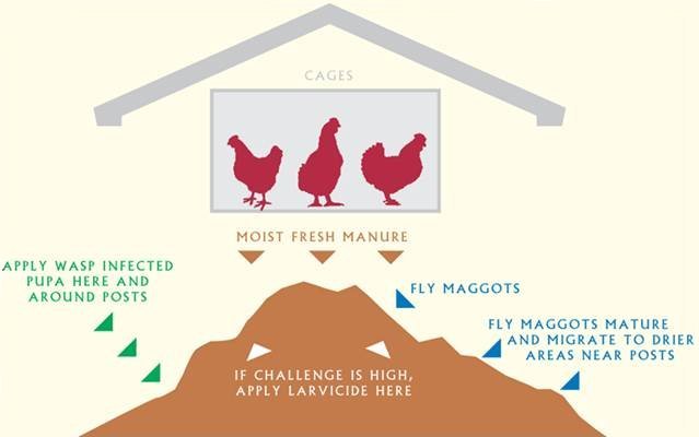 The wasp life cycle is a few days longer than the common flies found in poultry